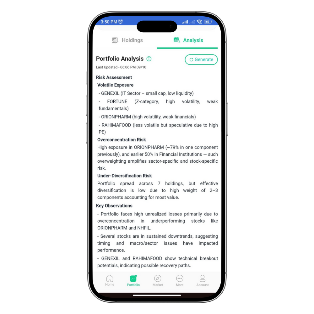 Portfolio Analysis হলো Biniyog অ্যাপের একটি ফিচার, যা আপনার সব শেয়ার একসাথে বিশ্লেষণ করে দেখায়। এতে আপনি এক নজরে বুঝতে পারবেন আপনার পোর্টফোলিও লাভে আছে নাকি লসে, কোথায় রিস্ক বেশি, আর কোন শেয়ারে সমস্যা হচ্ছে।